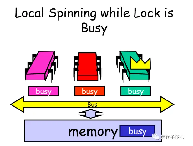 但是 TTAS 并非完美的算法它也有缺陷,就是在释放锁的过程中,锁的持有者会将值修改为 false ,这会导致自旋线程的CPU cache 失效。这时候它们都会去执行一次 test-and-set 指令以获取锁,于是总线流量升高。第一个成功获取锁的线程会使得其他线程失效,这些失效的线程接下来又重读那个值,从而引起一场总线流量风暴。最终,所有线程归于平静,进入本地自旋(本地自旋指反复的读取CPU cache 中的值而不是使用总线)。