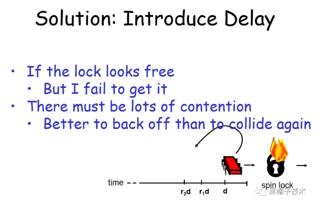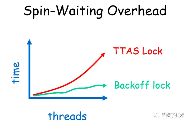 显然为了提高性能,我们应该避免高争用的情形。此时线程获得锁的机会非常小,因此这种尝试将会导致总线流量增加。相反如果让线程后退一段时间,给正在竞争的线程以结束的机会,将会更加有效。