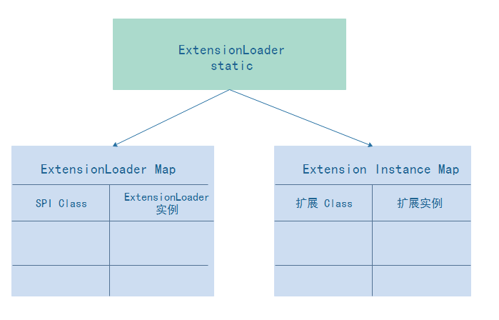 ExtensionLoader 中会存储两个静态属性 , EXTENSION_LOADERS 保存了内核开放的扩展点对应的 ExtensionLoader 实例对象 (说明了一种扩展点有一个对应的 ExtensionLoader 对象)。EXTENSION_INSTANCES 保存了扩展类型 (Class) 和扩展类型的实例对象。