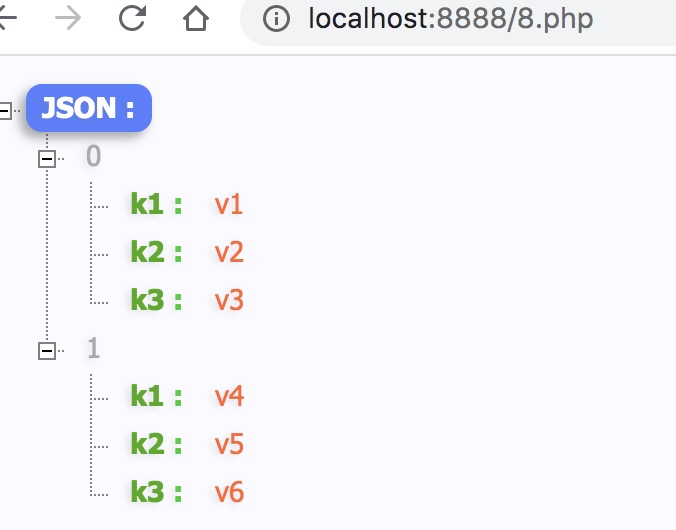 <?php //将PHP数组转化为JSON字符串 $a1 = array( "k1" => "v1", "k2" => "v2", "k3" => "v3" ) ; $a2 = array( "k1" => "v4", "k2" => "v5", "k3" => "v6" ) ; $aa = array($a1, $a2) ; $jsonStr = json_encode($aa) ; //直接打印 echo($jsonStr); ?>