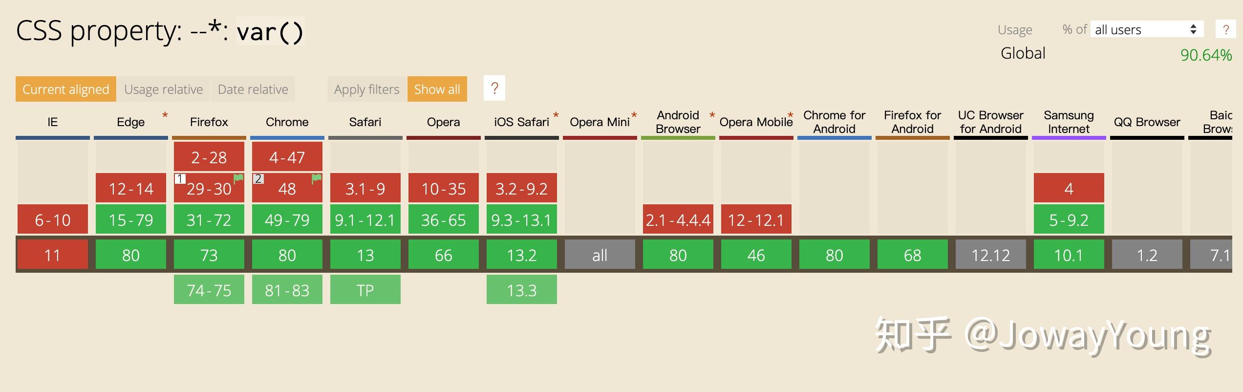 对于现代浏览器来说,CSS变量的兼容性其实还是蛮好的,所以大家可放心使用。毕竟现在都是各大浏览器厂商快速迭代的时刻,产品对于用户体验来说是占了很大比重,因此在条件允许的情况下还是大胆尝新,不要被一些过去的所谓的规范所约束着。