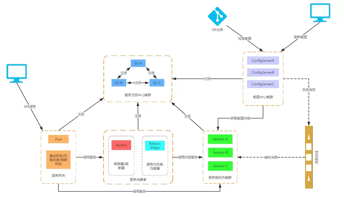 分布式消息队列,是对Kafka, MQ的封装;事件、消息总线,用于在集群(例如,配置变化事件)中传播状态变化,可与Spring Cloud Config联合实现热部署。 Spring cloud bus通过轻量消息代理连接各个分布的节点。这会用在广播状态的变化(例如配置变化)或者其他的消息指令。**Spring bus的一个核心思想是通过分布式的启动器对spring boot应用进行扩展,也可以用来建立一个多个应用之间的通信频道。**目前唯一实现的方式是用AMQP消息代理作为通道,同样特性的设置(有些取决于通道的设置)在更多通道的文档中。 Spring cloud bus被国内很多都翻译为消息总线,也挺形象的。大家可以将它理解为管理和传播所有分布式项目中的消息既可,其实本质是利用了MQ的广播机制在分布式的系统中传播消息,目前常用的有Kafka和RabbitMQ。利用bus的机制可以做很多的事情,其中配置中心客户端刷新就是典型的应用场景之一,我们用一张图来描述bus在配置中心使用的机制。