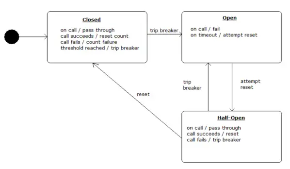 断路器可以防止一个应用程序多次试图执行一个操作,即很可能失败,允许它继续而不等待故障恢复或者浪费 CPU 周期,而它确定该故障是持久的。断路器模式也使应用程序能够检测故障是否已经解决。如果问题似乎已经得到纠正,应用程序可以尝试调用操作。