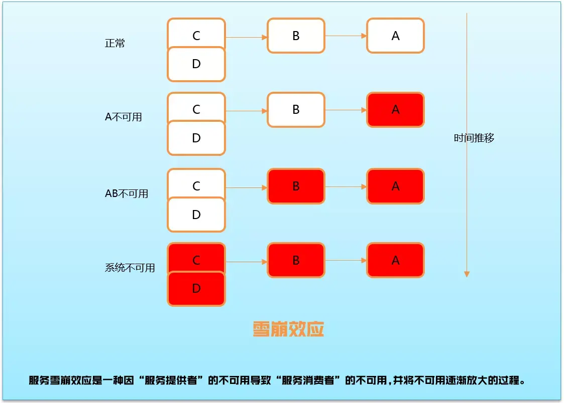 在微服务架构中通常会有多个服务层调用,基础服务的故障可能会导致级联故障,进而造成整个系统不可用的情况,这种现象被称为服务雪崩效应。服务雪崩效应是一种因“服务提供者”的不可用导致“服务消费者”的不可用,并将不可用逐渐放大的过程。