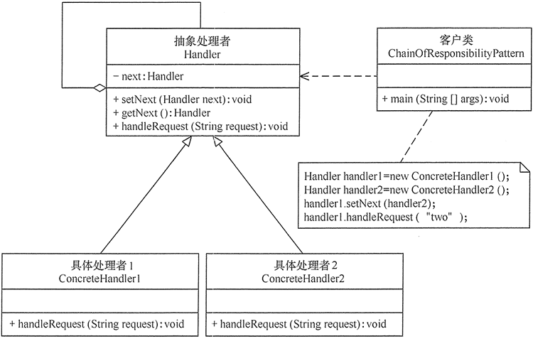 责任链(Chain of Responsibility)模式: 为了避免请求发送者与多个请求处理者耦合在一起,将所有请求的处理者通过前一对象记住其下一个对象的引用而连成一条链;
