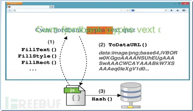 一个典型的利用Canvas api获取帆布指纹的场景:在Canvas画布上面画出各种内容之后,利用canvas.toDataURL()这个API获取到相应的base64编码作为输出的帆布指纹。