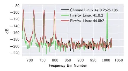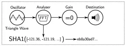 上图显示了如何使用AudioContext属性为音频堆栈设置指纹。首先,用OscillatorNode产生三角波,此信号通过AnalyserNode和ScriptProcessorNode传递。最后,信号通过增益设置为零的GainNode传递到,以在连接到音频上下文目的地(例如计算机扬声器)之前使任何输出静音。AnalyserNode提供对音频信号的快速傅里叶变换(FFT)的访问,该变换使用ScriptProcessorNode添加的onaudioprocess事件处理程序捕获。生成的FFT被输入到散列中并用作指纹。