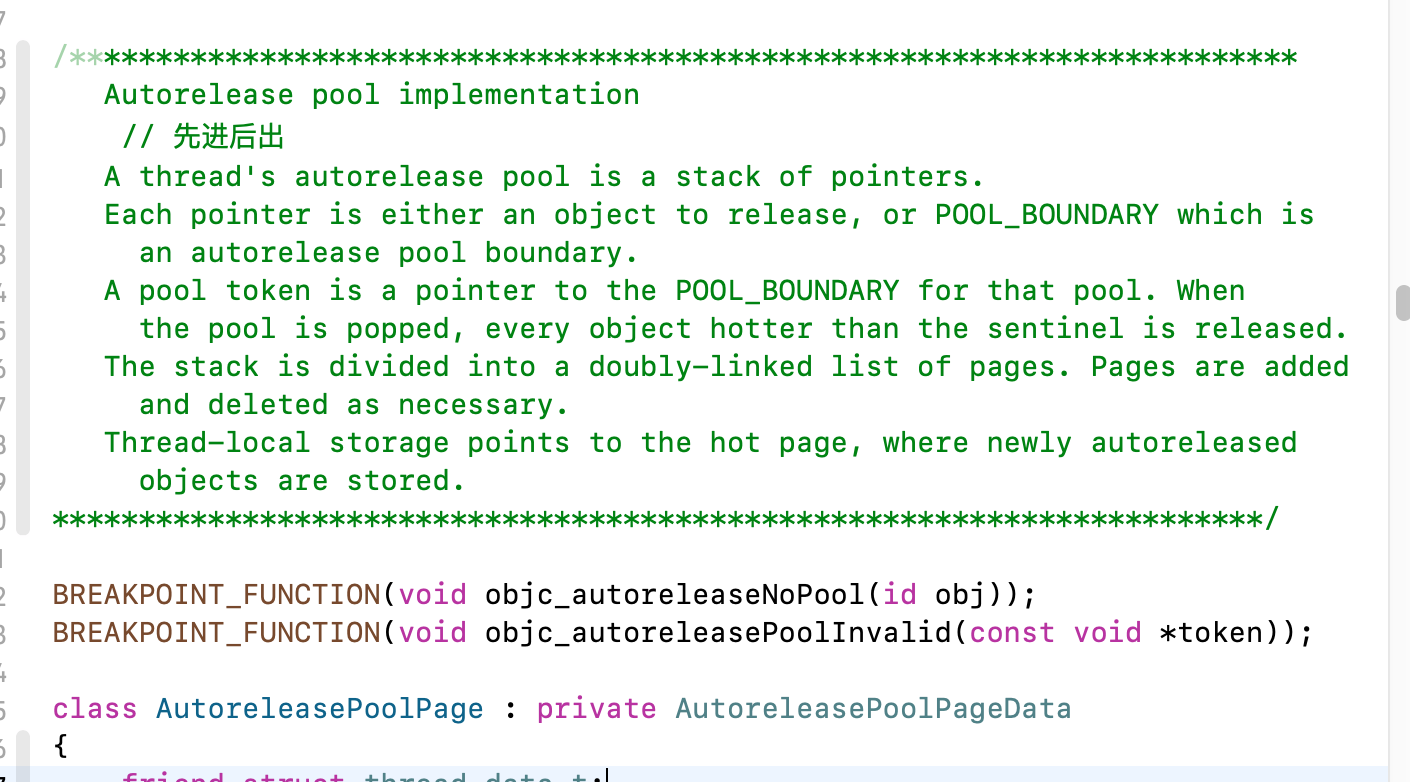 我们知道AutoreleasePoolPage是一个栈的形式,并且里面有一个边界对象,并且是一个双向链表,并且是跟线程一一对应的,这些解释跟上面的属性一一对应了