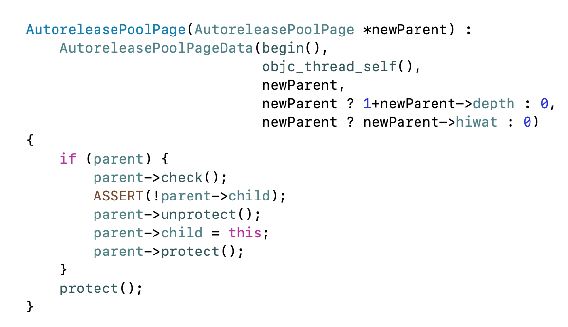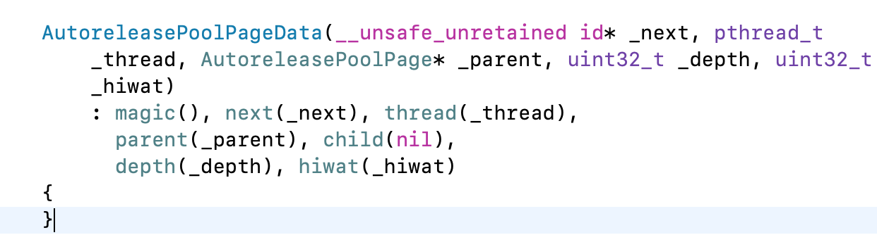 AutoreleasePoolPageData(__unsafe_unretained id* _next, pthread_t _thread, AutoreleasePoolPage* _parent, uint32_t _depth, uint32_t _hiwat)