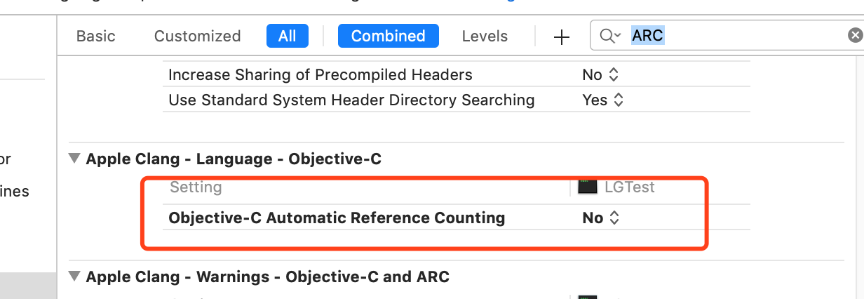 下面我们做个试验,将工程改成MRC,也就是在build setting里面搜一下ARC,将这个地方改成NO即可