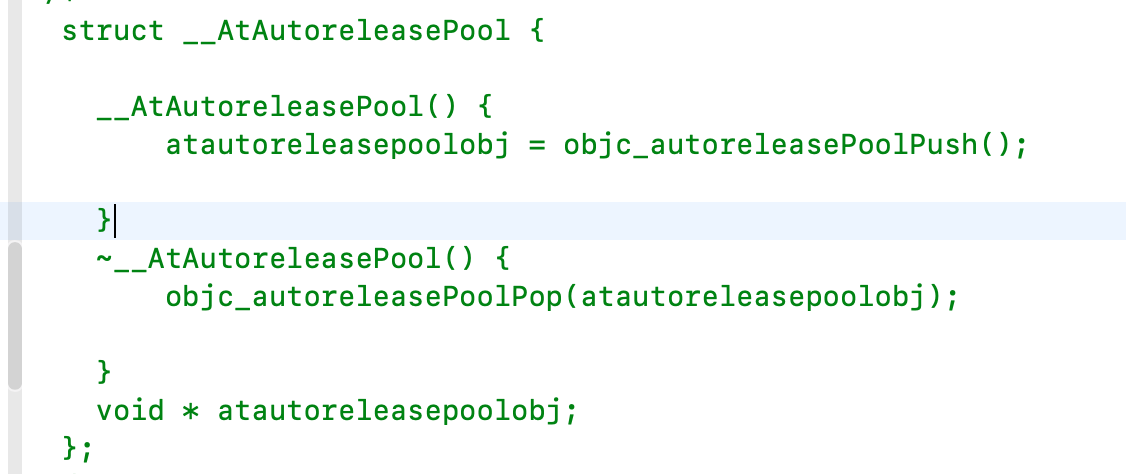 发现生成了一个__AtAutoreleasePool对象,在.cpp文件中找一下,然后发现这是个结构体