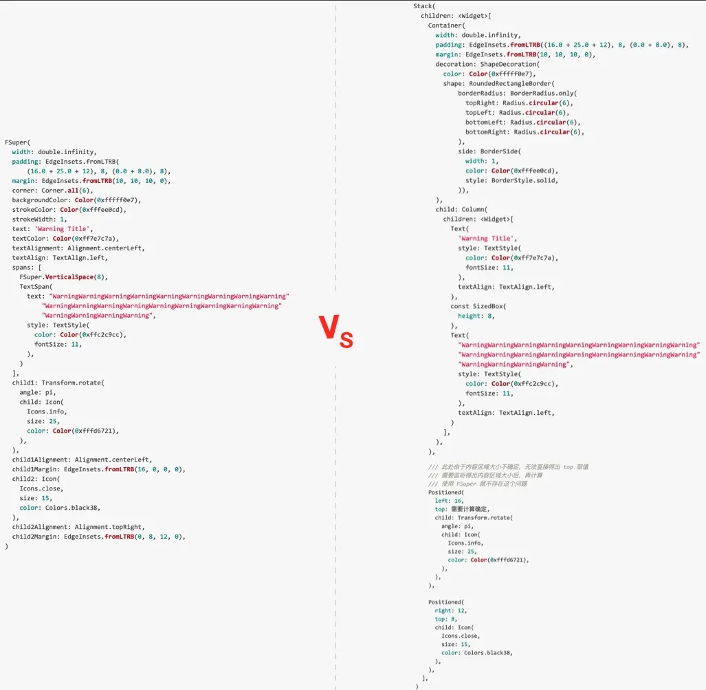 在不使用 FSuper 情况下,组织图中 【Warning】视图是比较困难的。除了需要额外增加组件嵌套,你很难在内容区域大小不确定的情况下来确定诸如 centerLeft、centerRight、.. 等对齐效果。更不用说需要对齐的所有组件的大小都不确定的情况了。