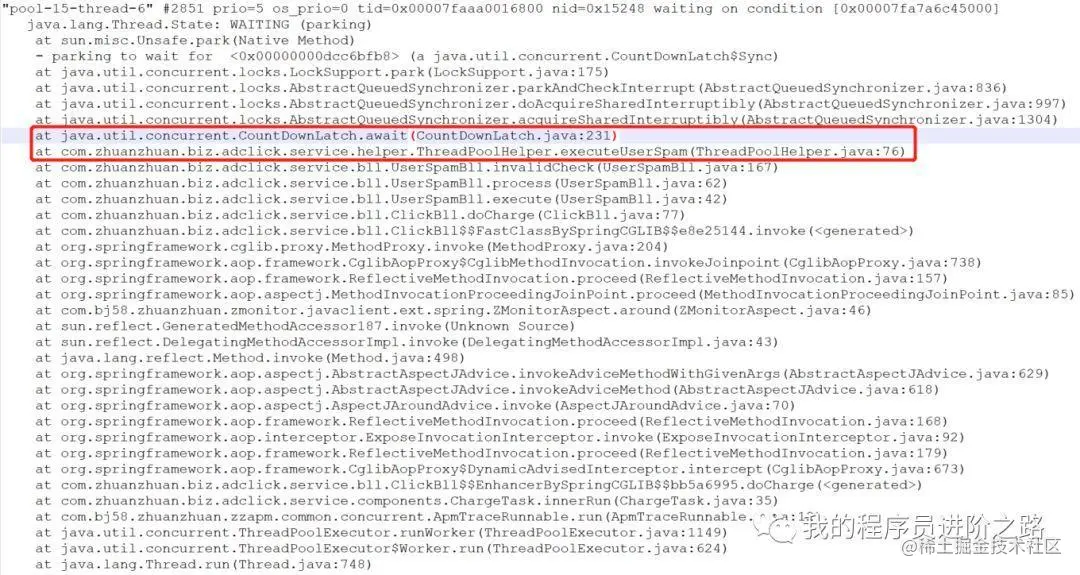 在jstack的日志文件中,立马发现了:用于扣费的业务线程池的所有线程都处于waiting状态,线程全部卡在了截图中红框部分对应的代码行上,这行代码调用了countDownLatch的await()方法,即等待计数器变为0后释放共享锁。