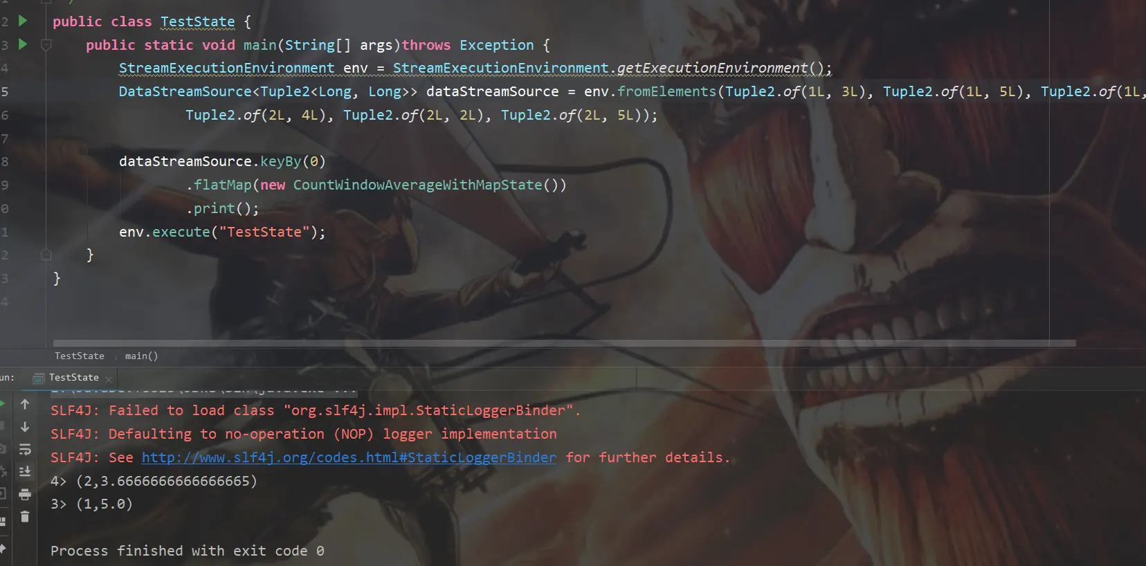 这里我们定义了一个输入类型Tuple2和一个输出类型Tuple2,这俩货对应的是模拟数据的key-value对,和输出的(1,5),(2,3.6666···)