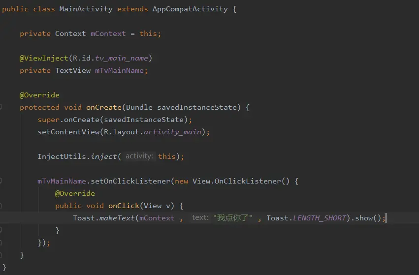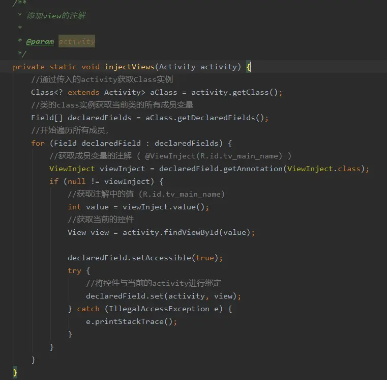 简单的IOC实现控件注入 A_B_C_Q 2020-03-26 129 阅读1分钟 自己实现了一个简单的控件注入的demo,今天就简单实现一个类似buttnife的功能开始 先 这句话开始分析,这句话就是将我们的当前类的实例传入进去,接下来我们开始看看里面做了什么? 代码中的注释写的已经很清楚了,亲测有效 最后在activity中这么设置一下就绑定了,OK,若是那里不对,请多多指教,谢谢 若是对您有一点点帮助希望能给点鼓励,您的鼓励实我前进的动力