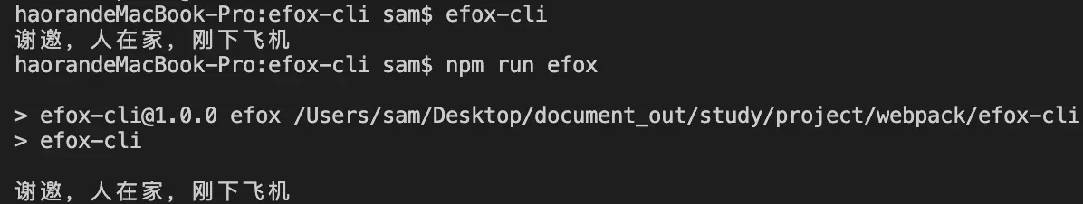 执行npm install -g 或 npm link将当前项目安装到全局环境,这样就可以直接使用efox-cli来运行文件了