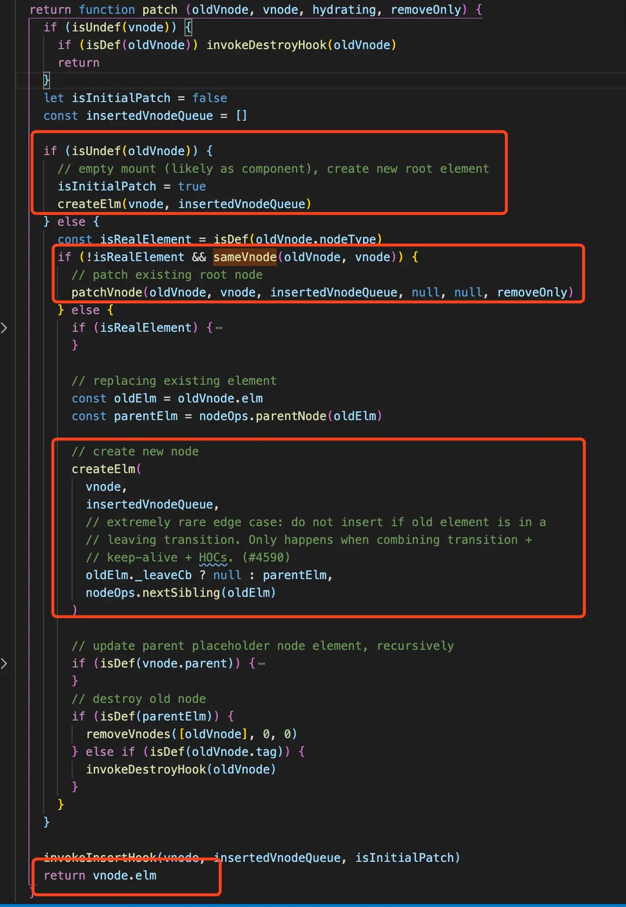 多次提到patchVnode,往前看patchVnode的部分,其处理的结果就是oldVnode.elm和vnode.elm得到了更新