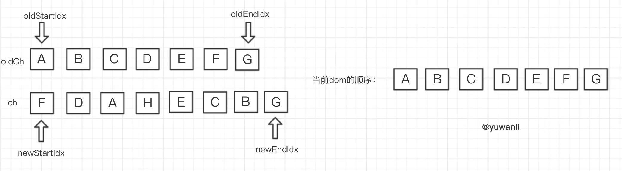 这里只要记住,oldCh和ch都是参照物,其中,ch是我们的目标顺序,而oldCh是我们用来了解当前dom顺序的参照。所以整个diff过程,就是对比oldCh和ch,确认当前round,oldCh如何移动更靠近ch,由于oldCh中待处理的部分仍在dom中,所以可以根据oldCh中的oldStartVnode的elm和 oldEndVnode的elm的位置,来确定匹配成功的元素该如何插入。