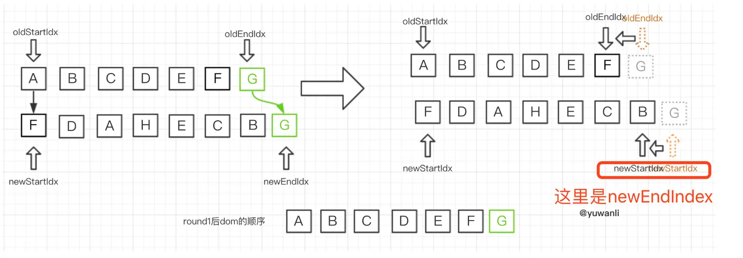 - 对比尾部,成功则patchVnode更新并oldEndIdx,newEndIdx左移动(参照round1)