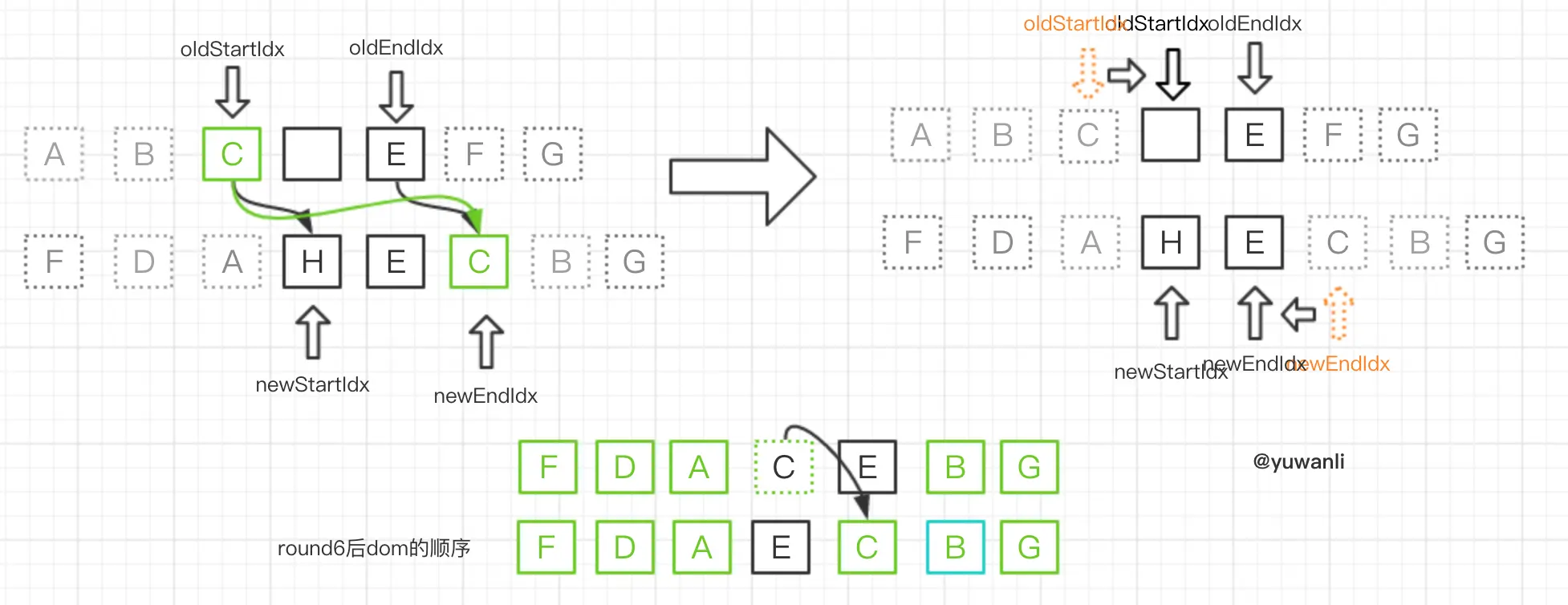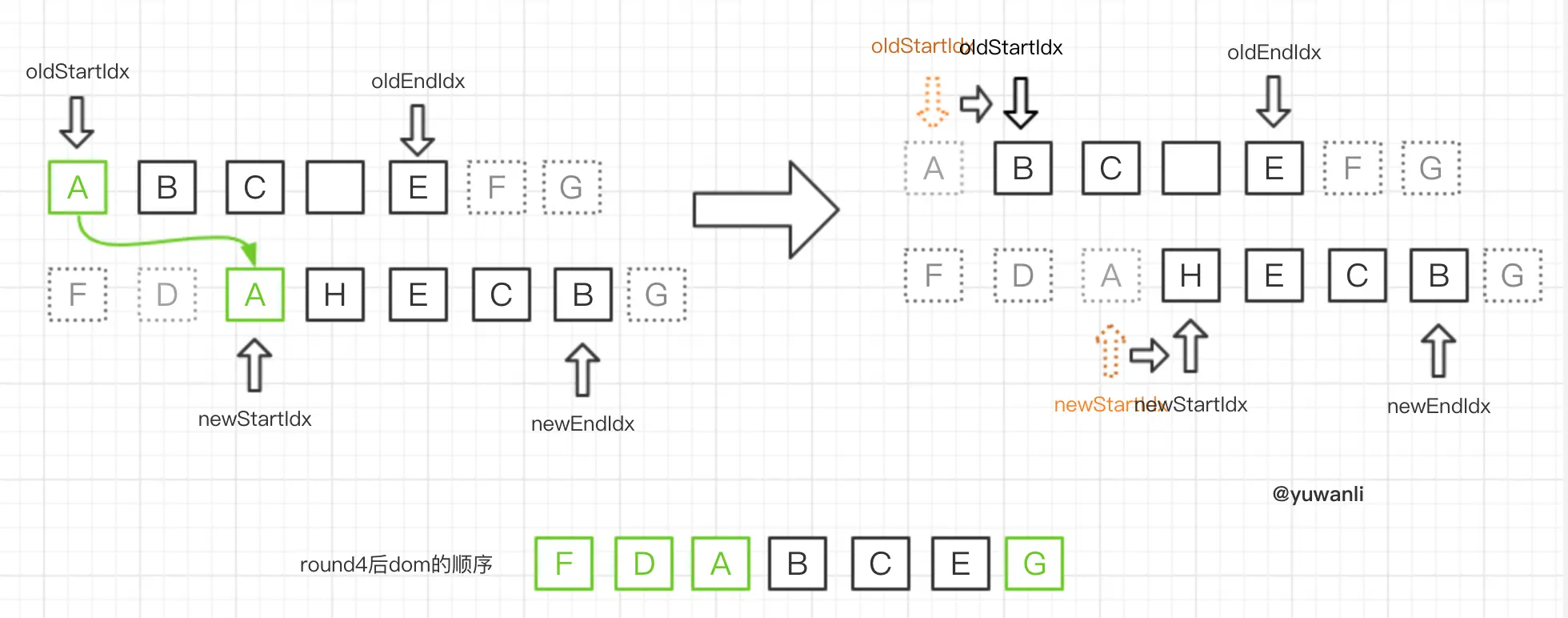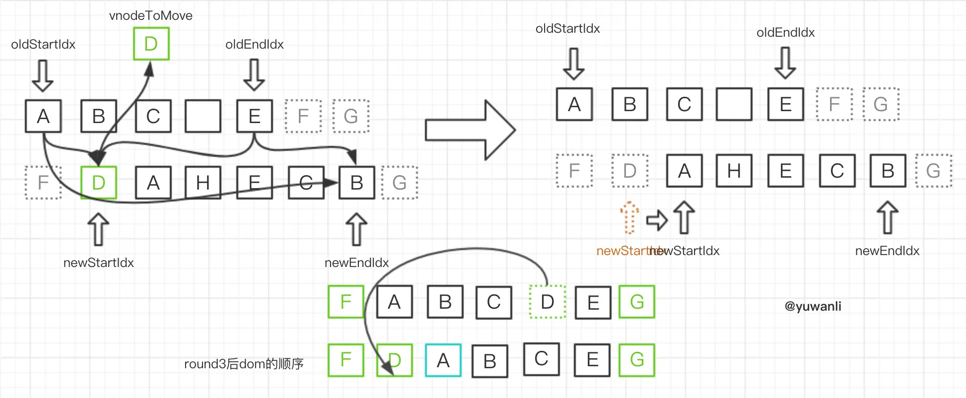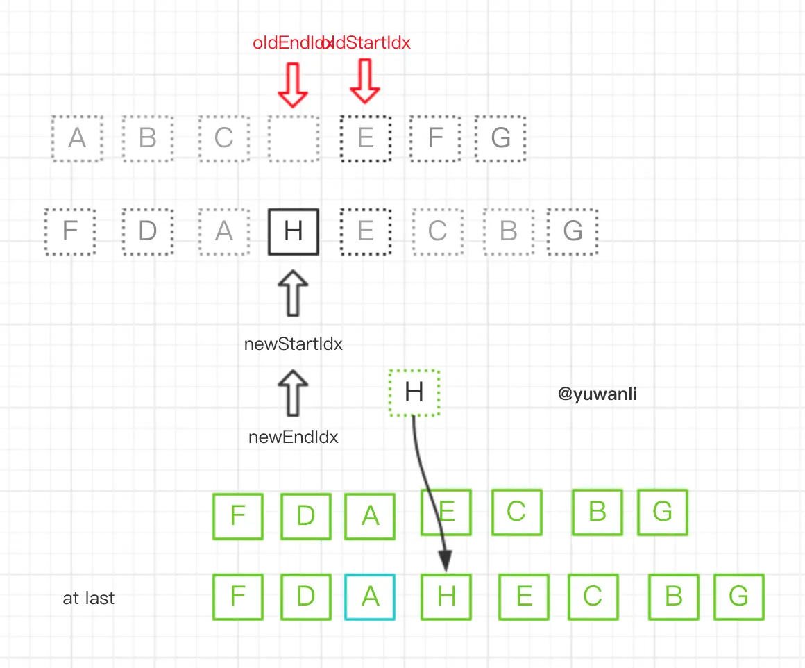 - 无oldStartVnode则开始oldStartIdx指针右移(参照round6)