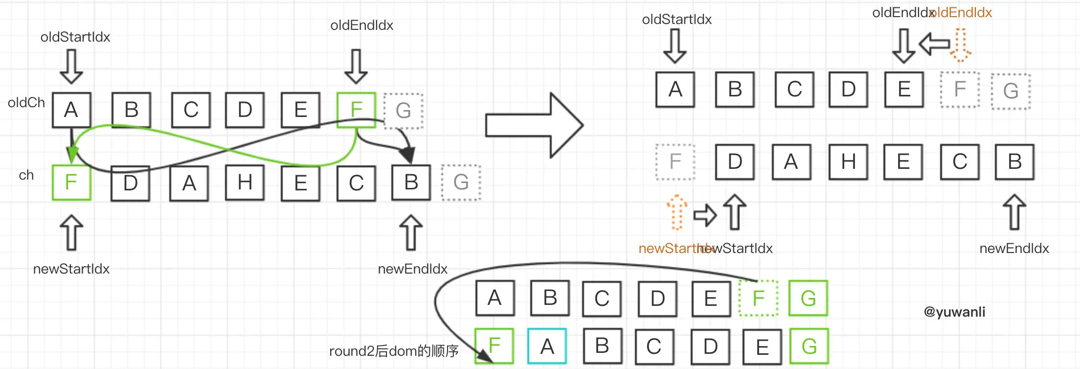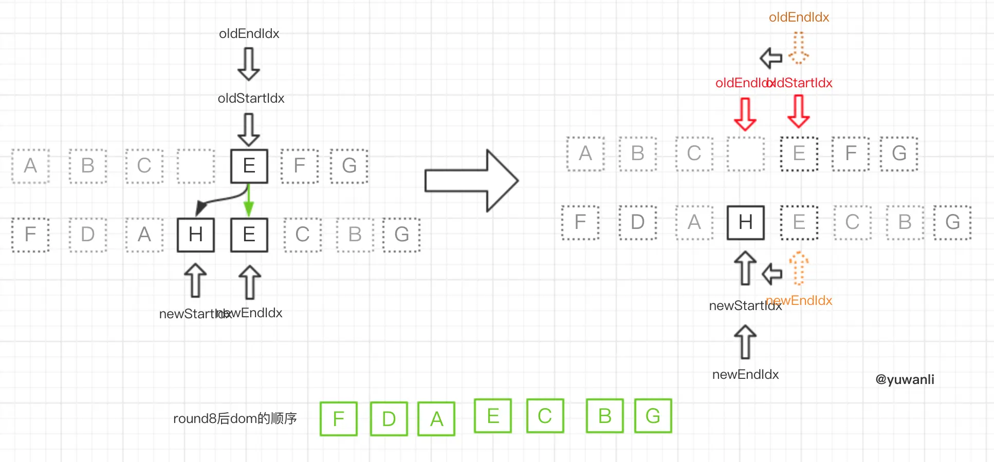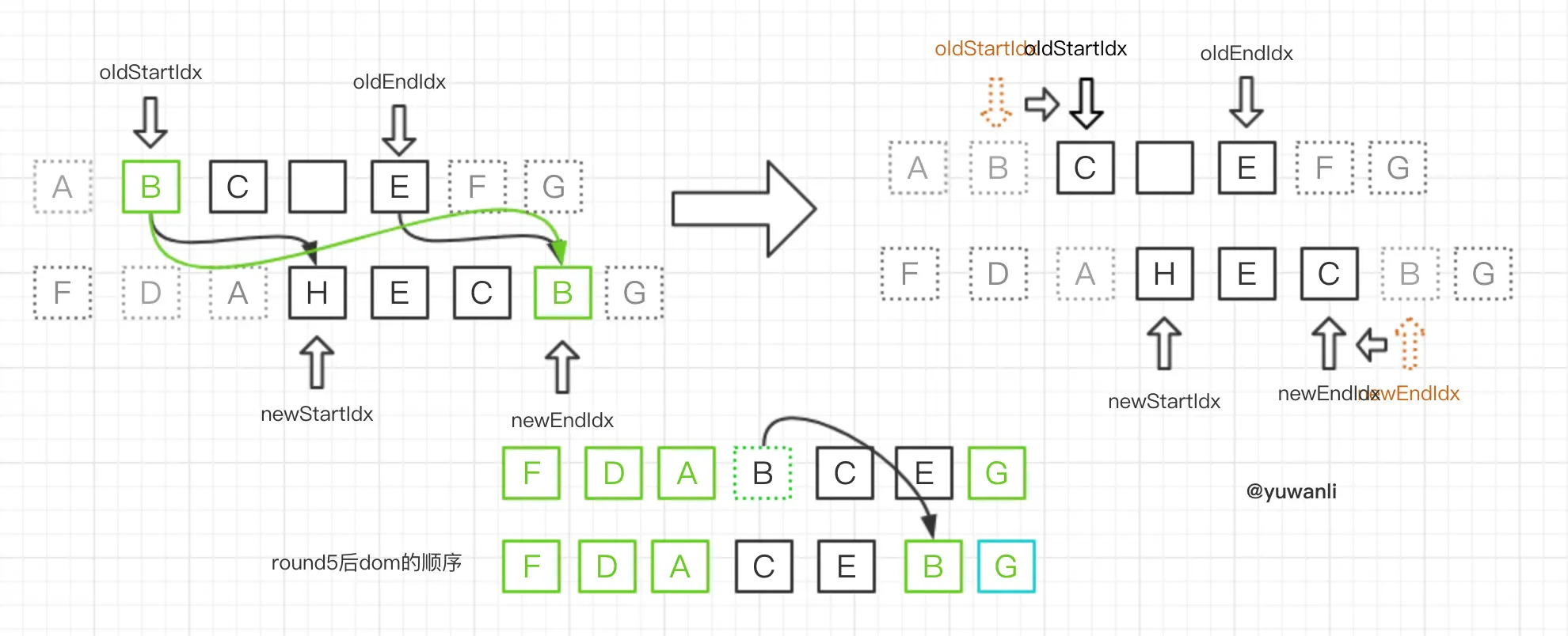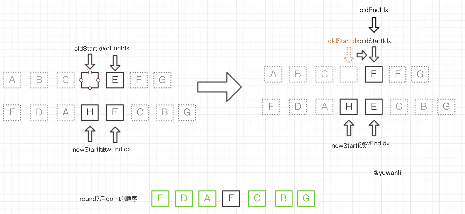 - 无oldStartVnode则开始oldStartIdx指针右移(参照round6)