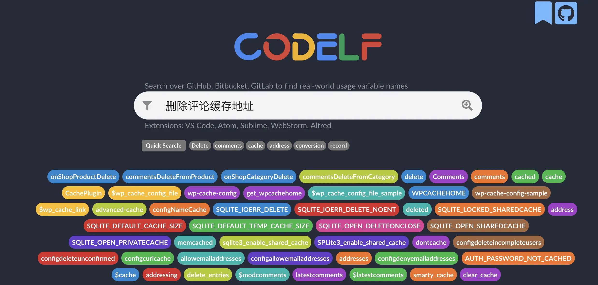 只需要输入 中文 在输入框回车等待片刻,CODEIF 会在无数的开源项目中查找代码,并返回结果供你挑选变量名,并且可以一键复制,一键查看到源码。