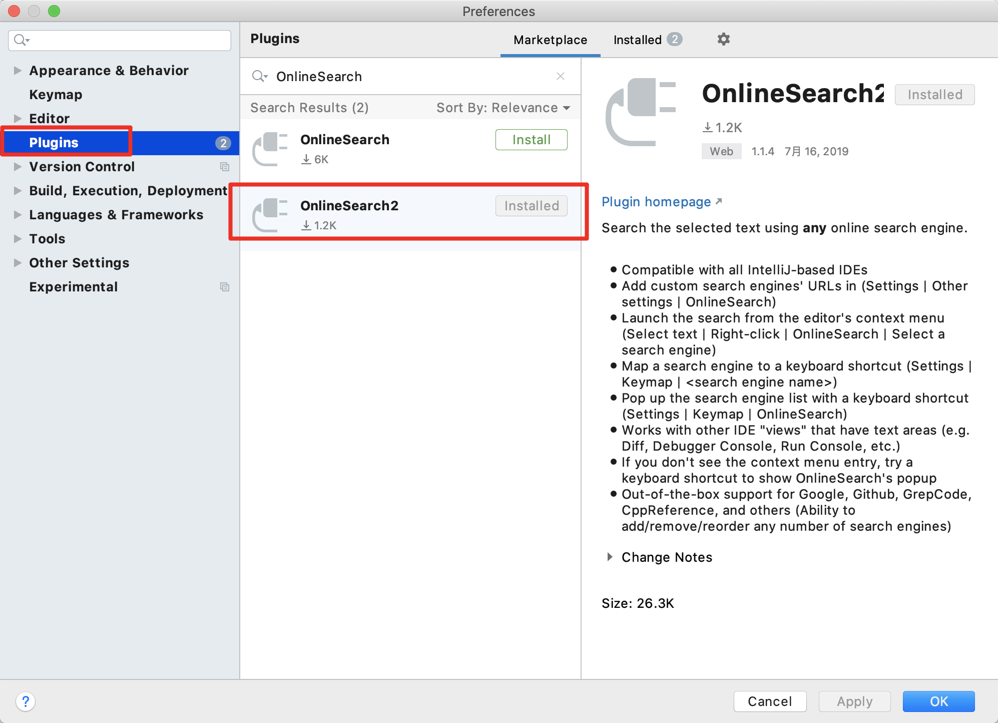 首先,在 IDEA 中搜索插件 OnlineSearch2 然后重启 IDEA WebStorm -> Preference -> Plugins -> Browse Repositories... -> 搜索"OnlineSearch2"并安装