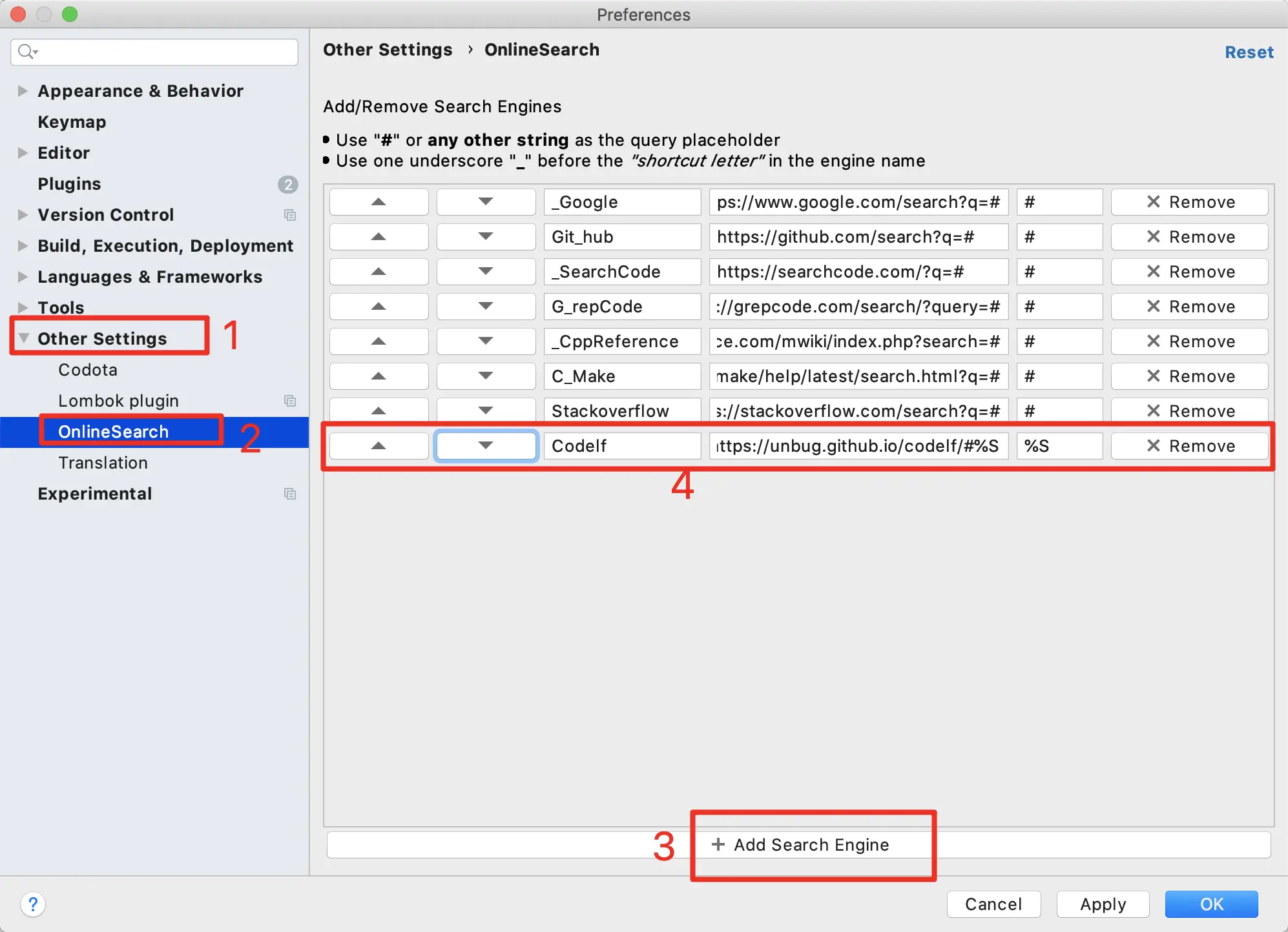 然后配置插件的地址,按照步骤添加即可 WebStorm -> Preference -> Other settings -> OnlineSearch -> 三个输入框依次输入:Codelf, unbug.github.io/codelf/#%S 和 %S -> 然后点击”Apply“完成。