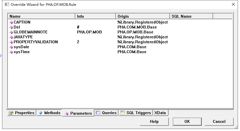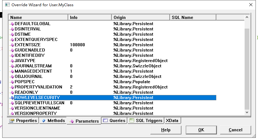 - 在Studio中的“类Class”菜单上,选择“替代Override”。在出现的对话框中,转到“参数Parameters”选项卡,然后选择“ ROWLEVELSECURITY”参数。