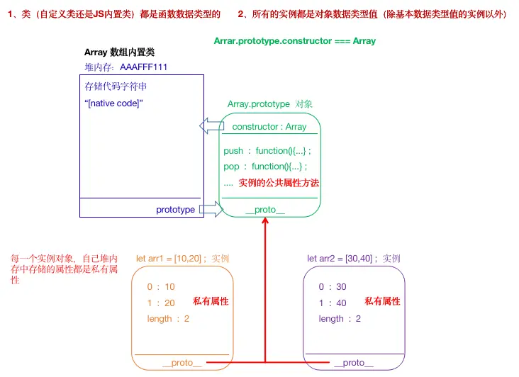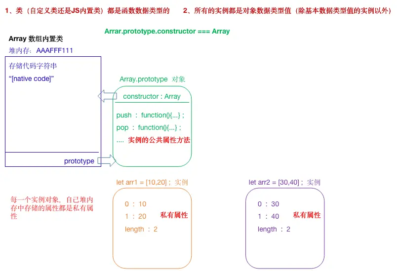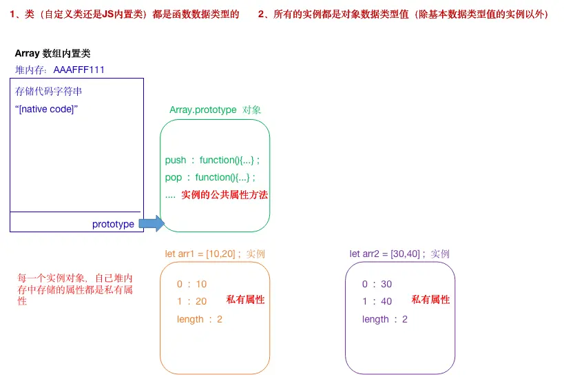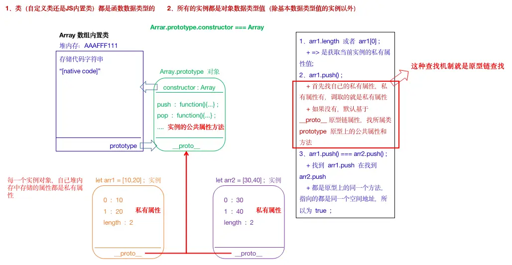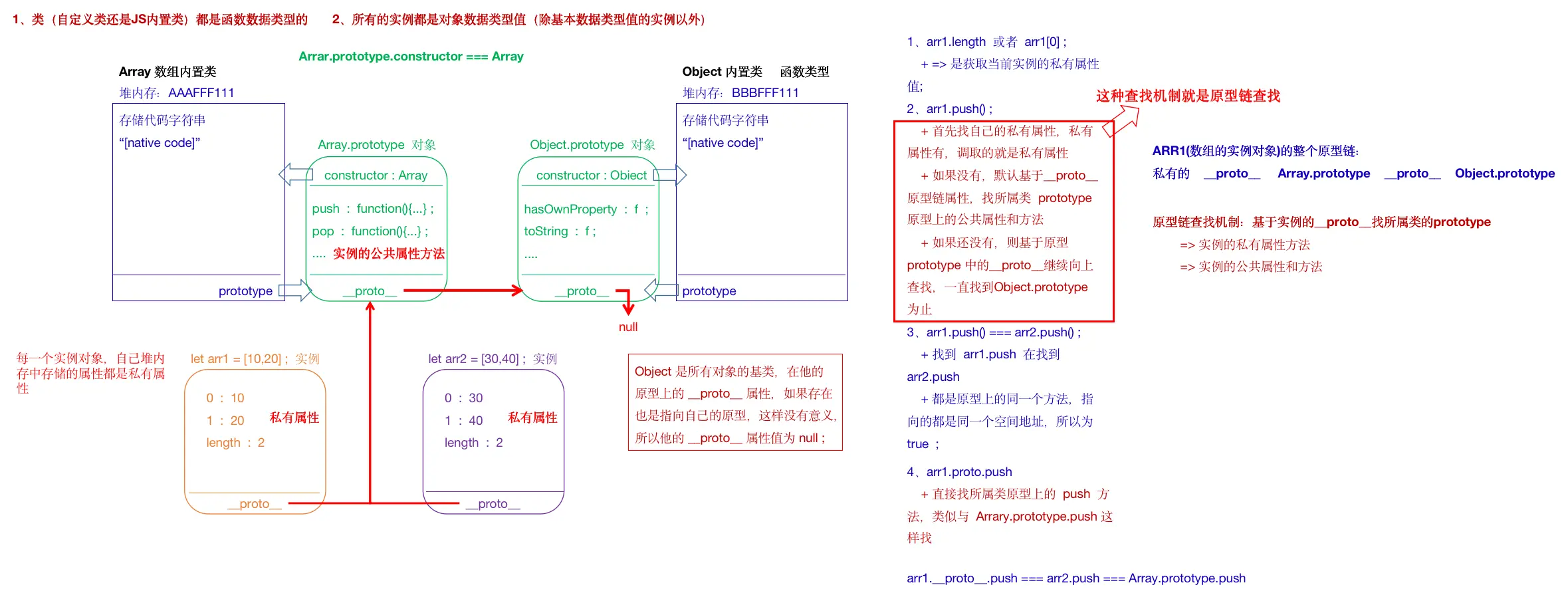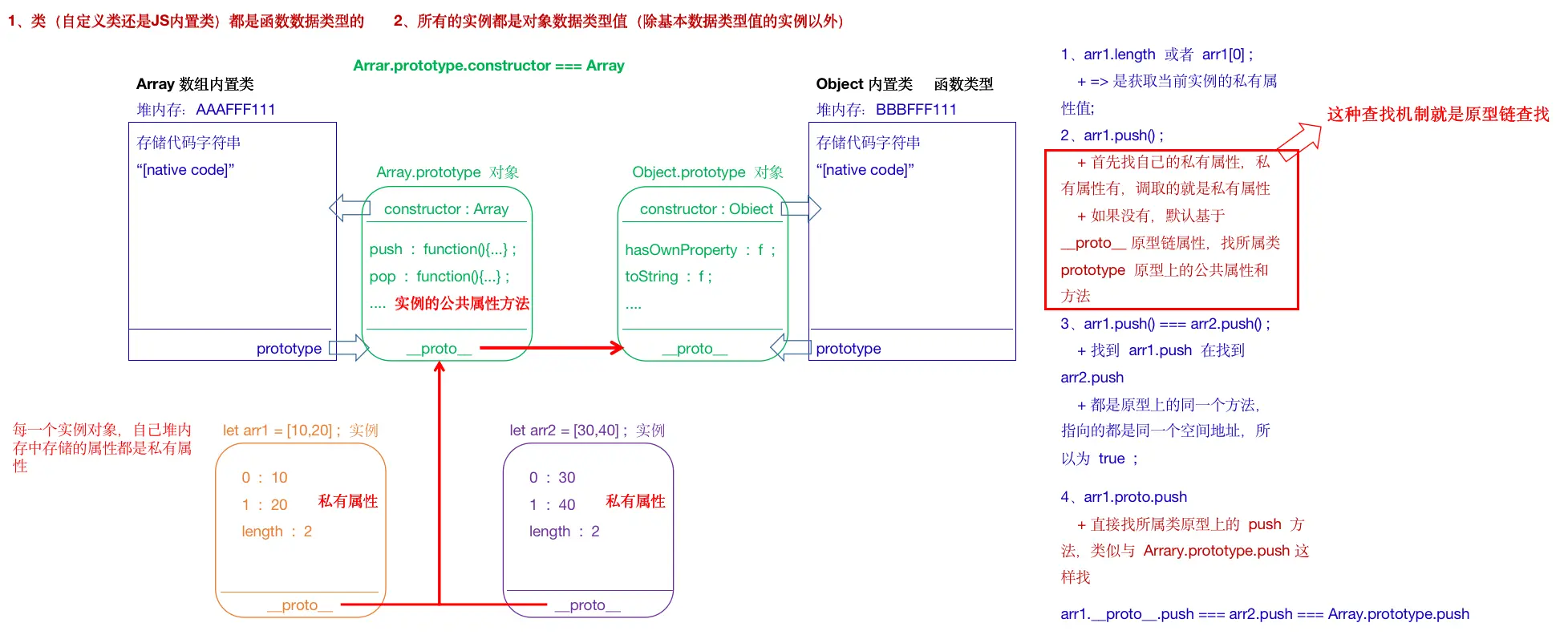 * Array.prototype:数组作为Array的实例,就可以调取原型上的公共属性方法,完成数组的相关操作 => arr.push():arr基于__proto__原型链的查找机制,找到Array.prototype上的push方法,然后把push方法执行,push方法执行