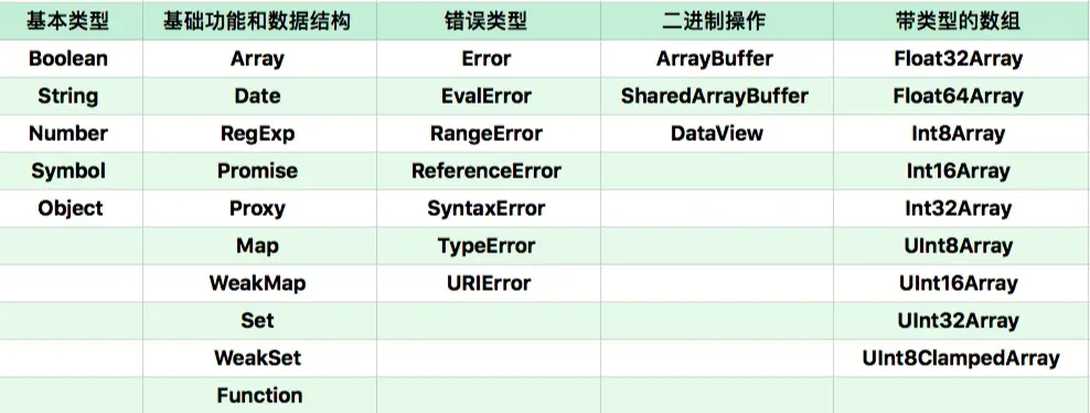 Array、Date、RegExp、Promise、Proxy、Map、WeakMap、Set、WeapSet、Function、Boolean、 String、Number、Symbol、Object、Error、EvalError、RangeError、ReferenceError、SyntaxError