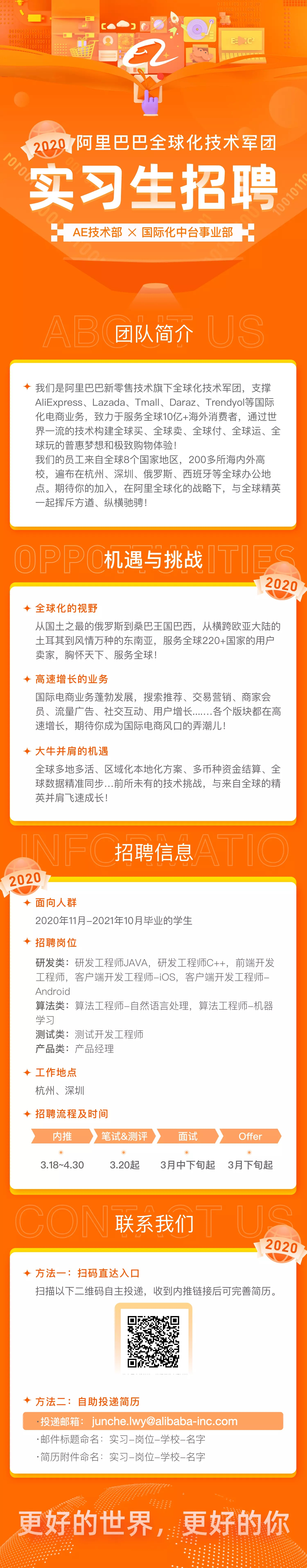 岗位需求:IOS开发工程师, Android开发工程师,前端工程师(Node,web),服务端开发工程师,测试开发工程师,算法工程师 投递方式:扫二维码投递、邮箱junche.lwy@alibaba-inc.com