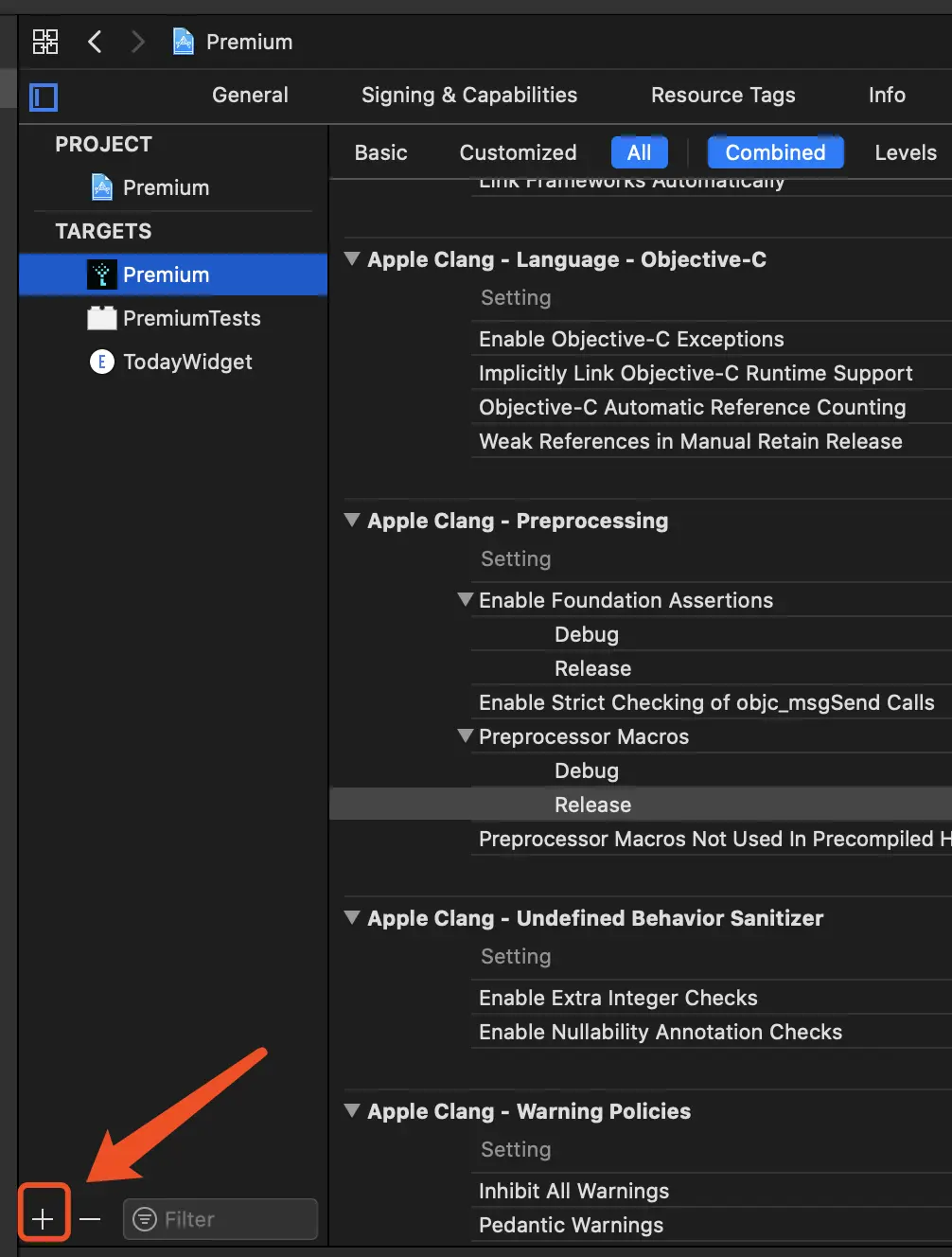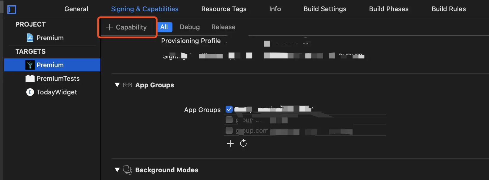 - 点击如下红框按钮,弹出后选择 App Groups,然后点击App Groups 下面的“+”,输入名称。两个需要通讯的 targte 分别设置,例子中选中“Premium”和“TodayWidget”分别设置。记得勾选刚才设置的名称。