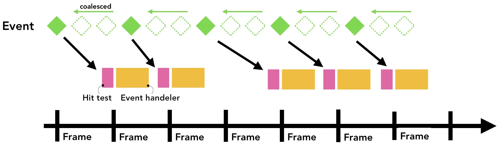 在上一篇文章中,我们讨论了典型的显示如何每秒刷新屏幕60次,以及如何保持节奏以实现平滑动画。 对于 input,触摸屏设备最典型的是发送 60-120次/s touch-screen 事件,而对于鼠标 100次/s。 input 事件的保真度高于我们的屏幕刷新能力。