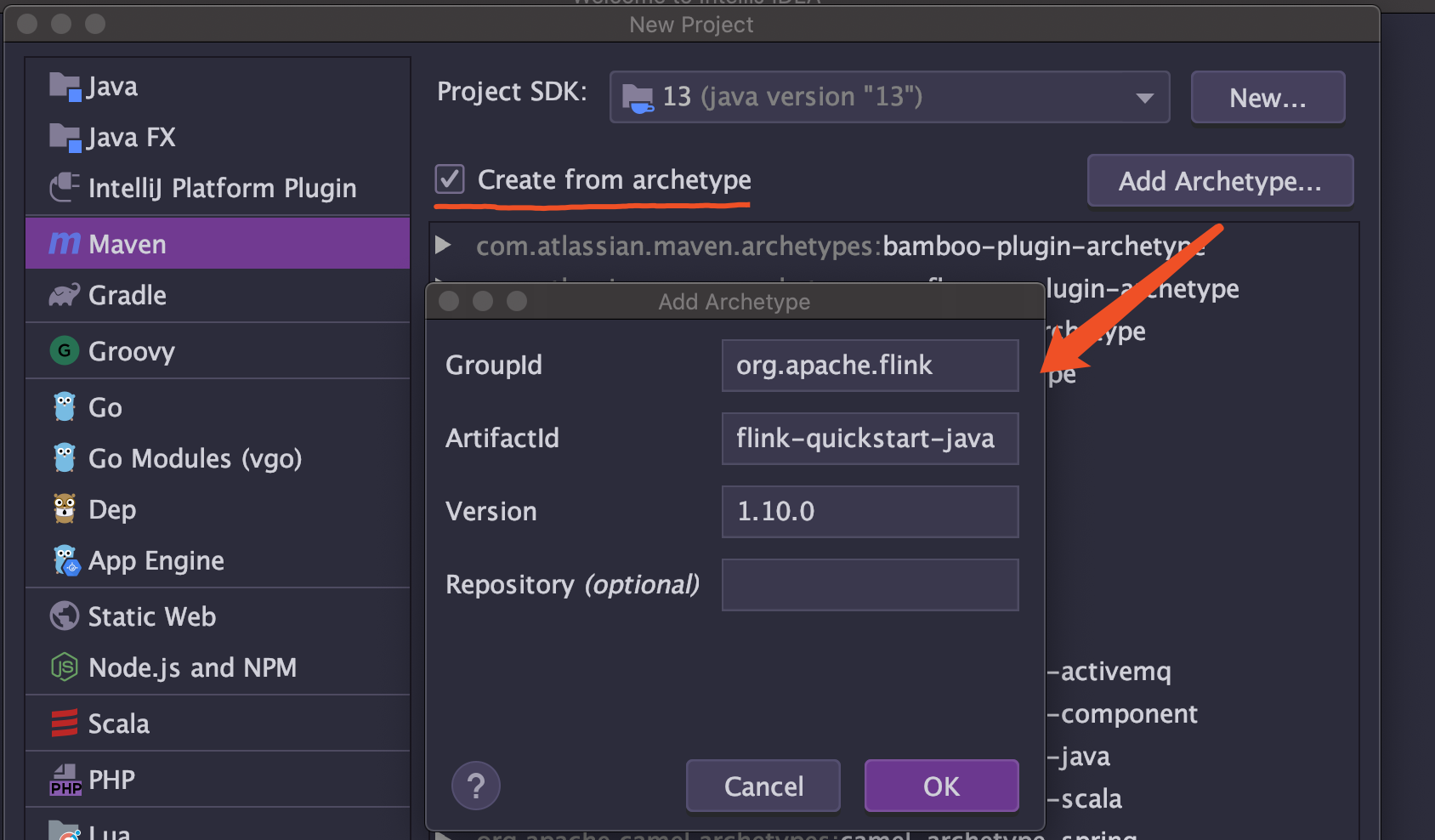 下一步,选择 maven 项目,并且勾选: Create from archetype 选项(目的是使用 flink 官方提供的项目模板快速生成项目结构)