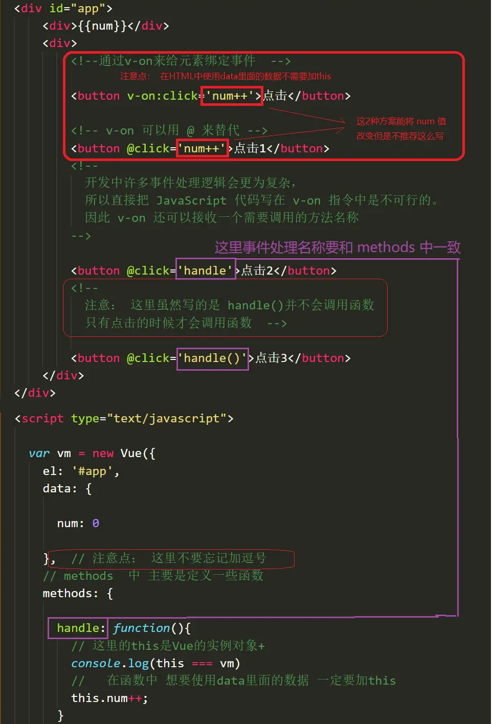 - 形式如:v-on:click 缩写为 @click;->点击时触发
