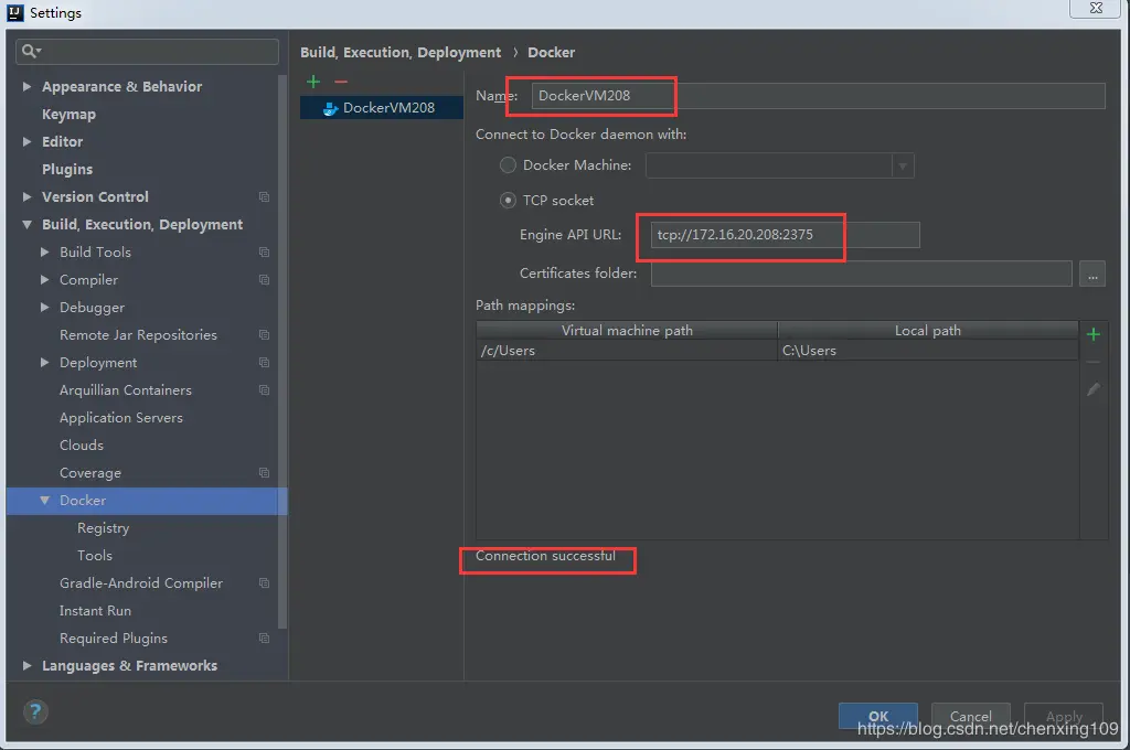 配置Docker 打开小扳手(setting)找到docker,输入虚拟机ip,不出意外会连接成功的。