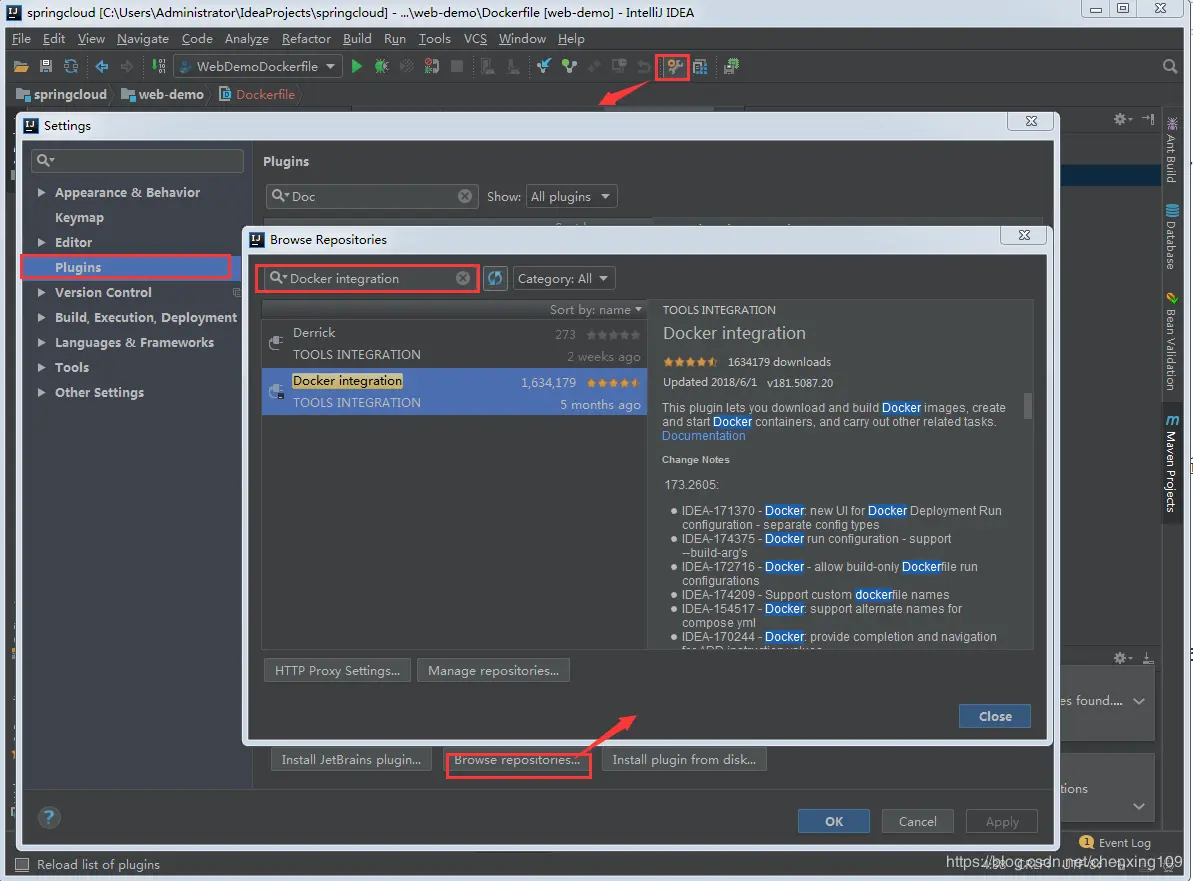 安装IDEA插件 安装Docker integration插件,如果没安装,按照下图指引方式安装插件。
