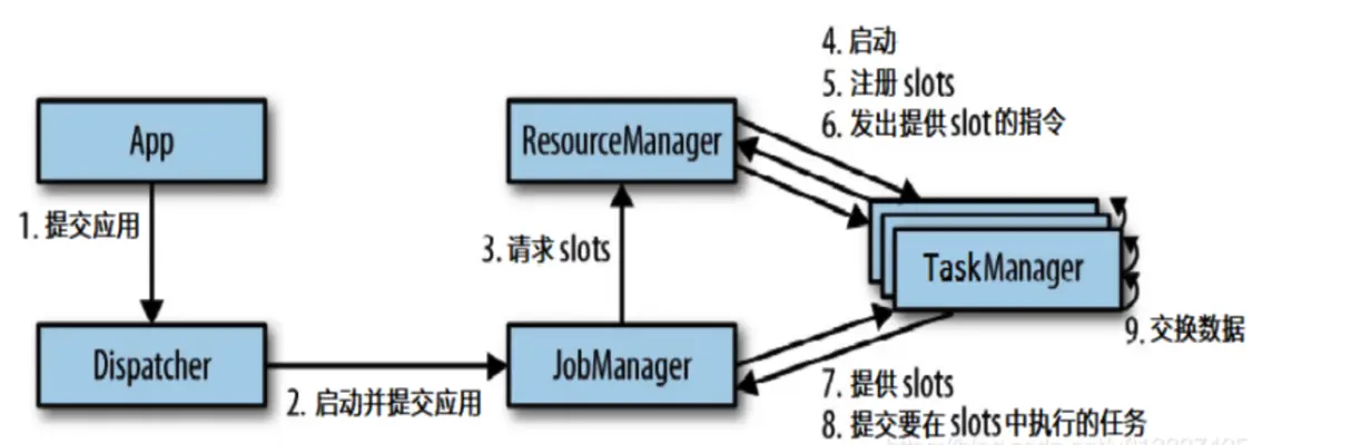 2)Dispatcher把JobManager进程启动,把应用交给JobManager。