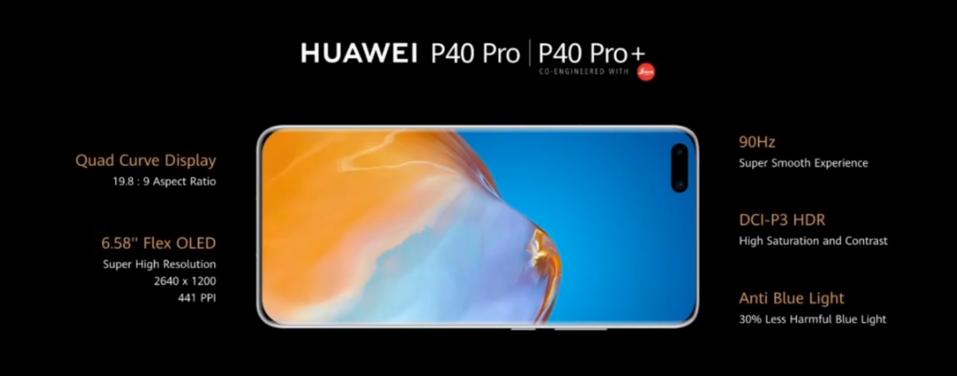 屏幕素质方面,P40 Pro和Pro+,都是OLED屏幕,分辨率皆为2640*1200,441PPI,P3色域覆盖。