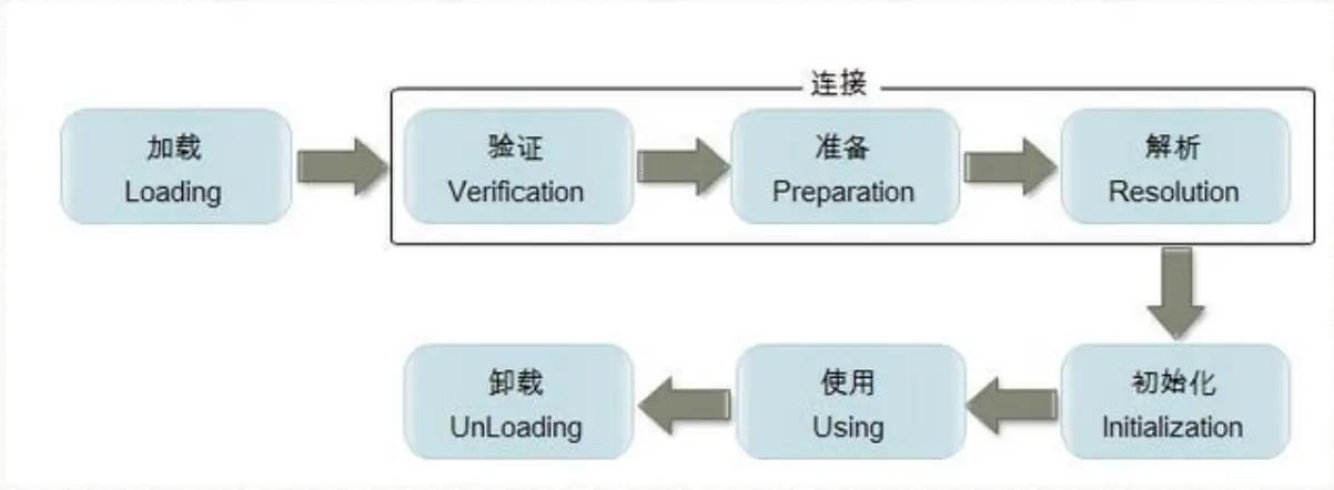 装载(加载) 类的装载指的是将类的.class文件中的二进制数据读入到内存中,将其放在运行时数据区的方法区内,然后在堆区创建一个java.lang.Class对象,用来封装类在方法区内的数据结构。类的加载的最终产品是位于堆区中的Class对象,Class对象封装了类在方法区内的数据结构,并且向Java程序员提供了访问方法区内的数据结构的接口。 类加载器并不需要等到某个类被“首次主动使用”时再加载它,JVM规范允许类加载器在预料某个类将要被使用时就预先加载它,如果在预先加载的过程中遇到了.class文件缺失或存在错误,类加载器必须在程序首次主动使用该类时才报告错误(LinkageError错误)如果这个类一直没有被程序主动使用,那么类加载器就不会报告错误。 加载.class文件的方式有: 1). 从本地系统中直接加载 2). 通过网络下载.class文件 3). 从zip,jar等归档文件中加载.class文件 4). 从专有数据库中提取.class文件 5). 将Java源文件动态编译为.class文件 在了解了什么是类的加载后,回头来再看jvm进行类加载阶段都做了什么。虚拟机需要完成以下三件事情: 1).通过一个类的全限定名称来获取定义此类的二进制字节流。 2).将这个字节流所代表的静态存储结构转化为方法区的运行时数据结构。 3).在java堆中生成一个代表这个类的java.lang.Class对象,作为方法区这些数据的访问入口。 相对于类加载过程的其他阶段,加载阶段是开发期相对来说可控性比较强,该阶段既可以使用系统提供的类加载器完成,也可以由用户自定义的类加载器来完成,开发人员可以通过定义自己的类加载器去控制字节流的获取方式。加载阶段完成后,虚拟机外部的二进制字节流就按照虚拟机所需的格式存储在方法区之中,而且在Java堆中也创建一个java.lang.Class类的对象,这样便可以通过该对象访问方法区中的这些数据。