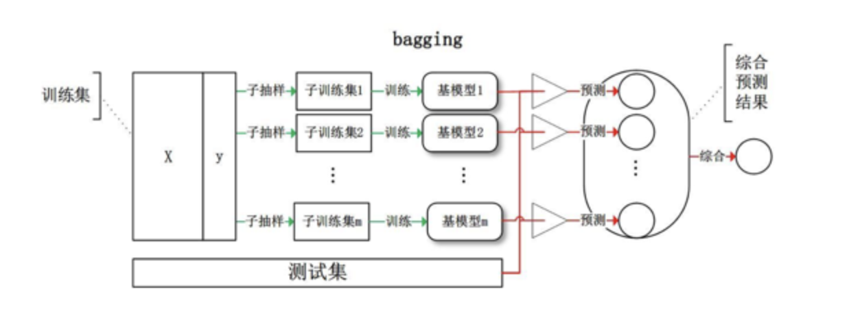 每次boostrap得到的训练集给每个弱模型训练,然后融合结果(这里的基学习器权重是各自的,并行学习)