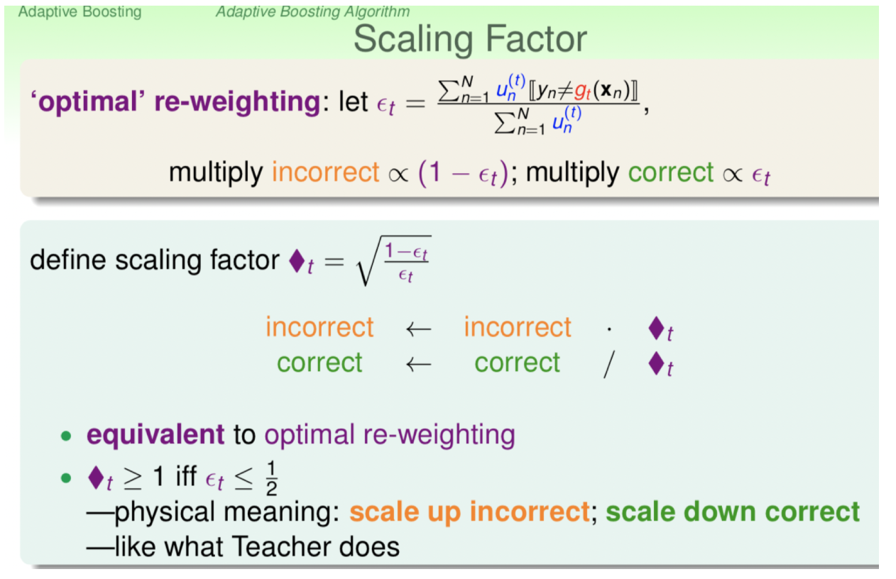 - 自适应的参数权重改变(选用指数损失函数),这里用林轩田老师的图(也可以根据分错的数据来进行数据的再采样)