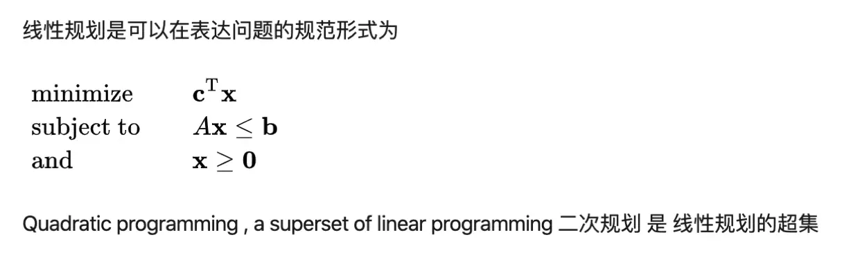 - 如果目标函数是二次的且约束是线性的(一次方关系),则使用二次规划技术