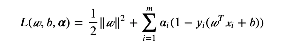 - 如果满足约束条件,我们拉格朗日函数的后一项,即∑(α(1-y(wx+b))) 必然<=0, 因为α是>=0的,那么当max 拉格朗日函数时,最大的是什么,当然就只能是我们的w平方/2啦,即上图中的□,而此时在min,看看,是不是跟原来的问题一毛一样。对了,此时将得到最优解,而这个时候α(1-y(wx+b))=0,这个也是构成KKT条件的一部分。