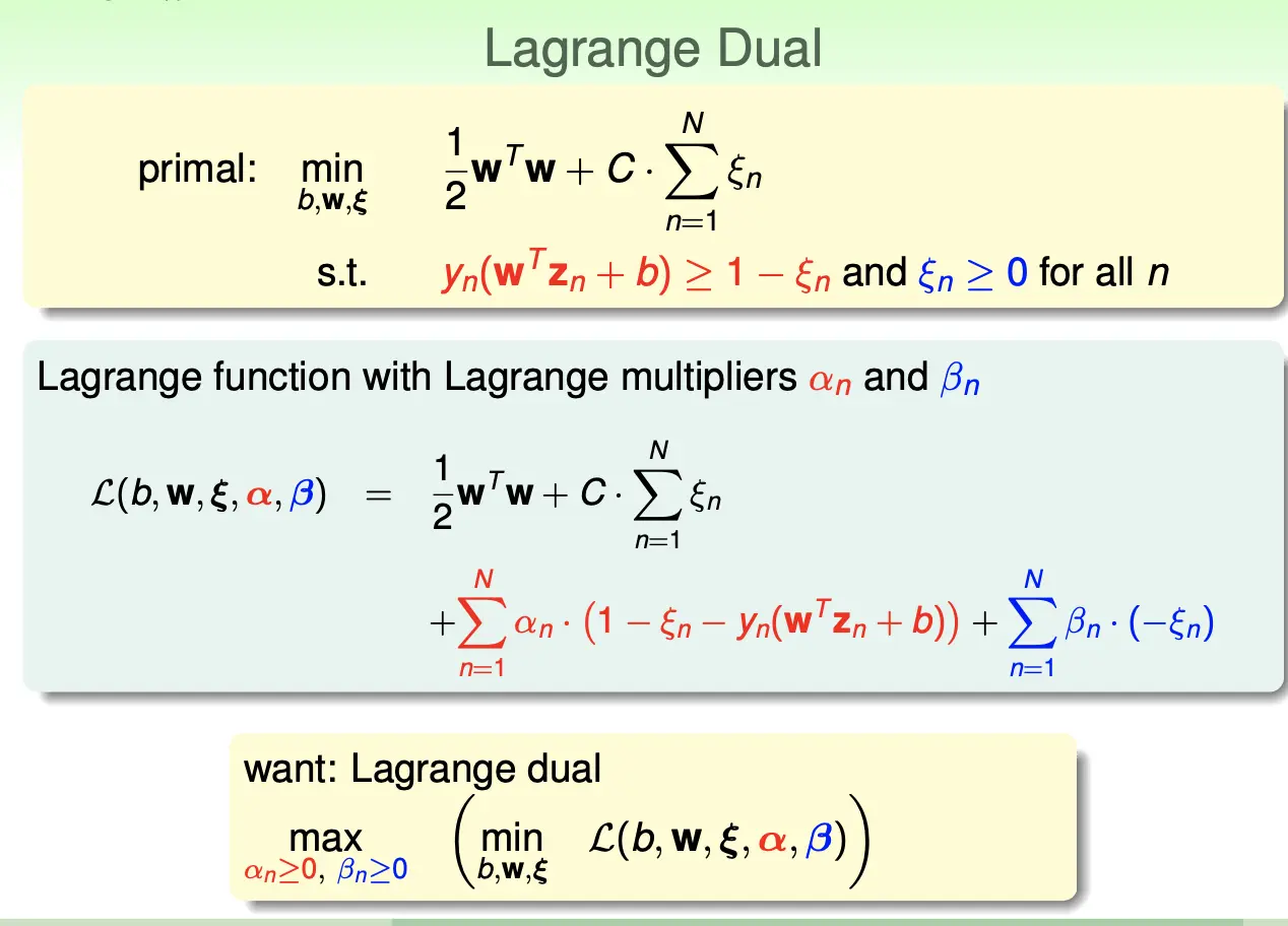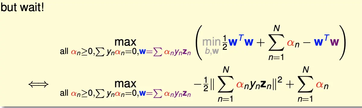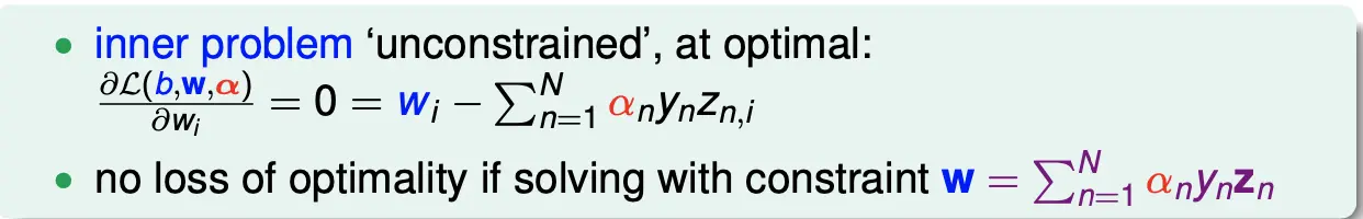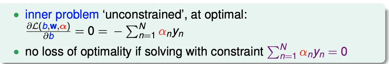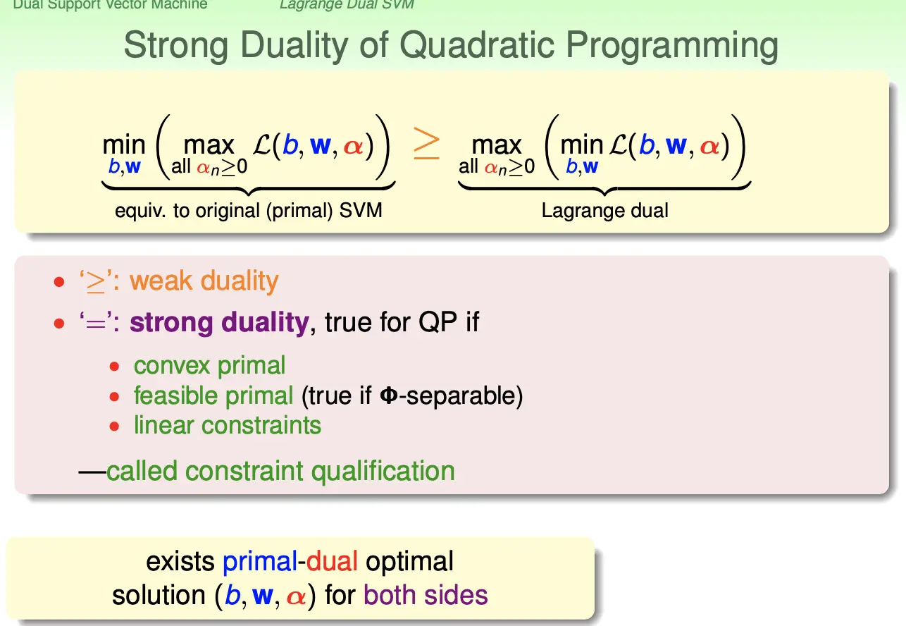我们的问题是二次规划问题,做最佳化的人推导一下发现,对于二次规划问题来说,如果我们要解的问题是convex的凸的,原来问题有解的(原来条件下能找到最优值),有线性的约束条件------>就有强对偶关系。