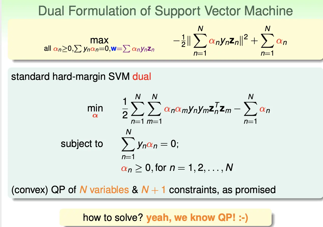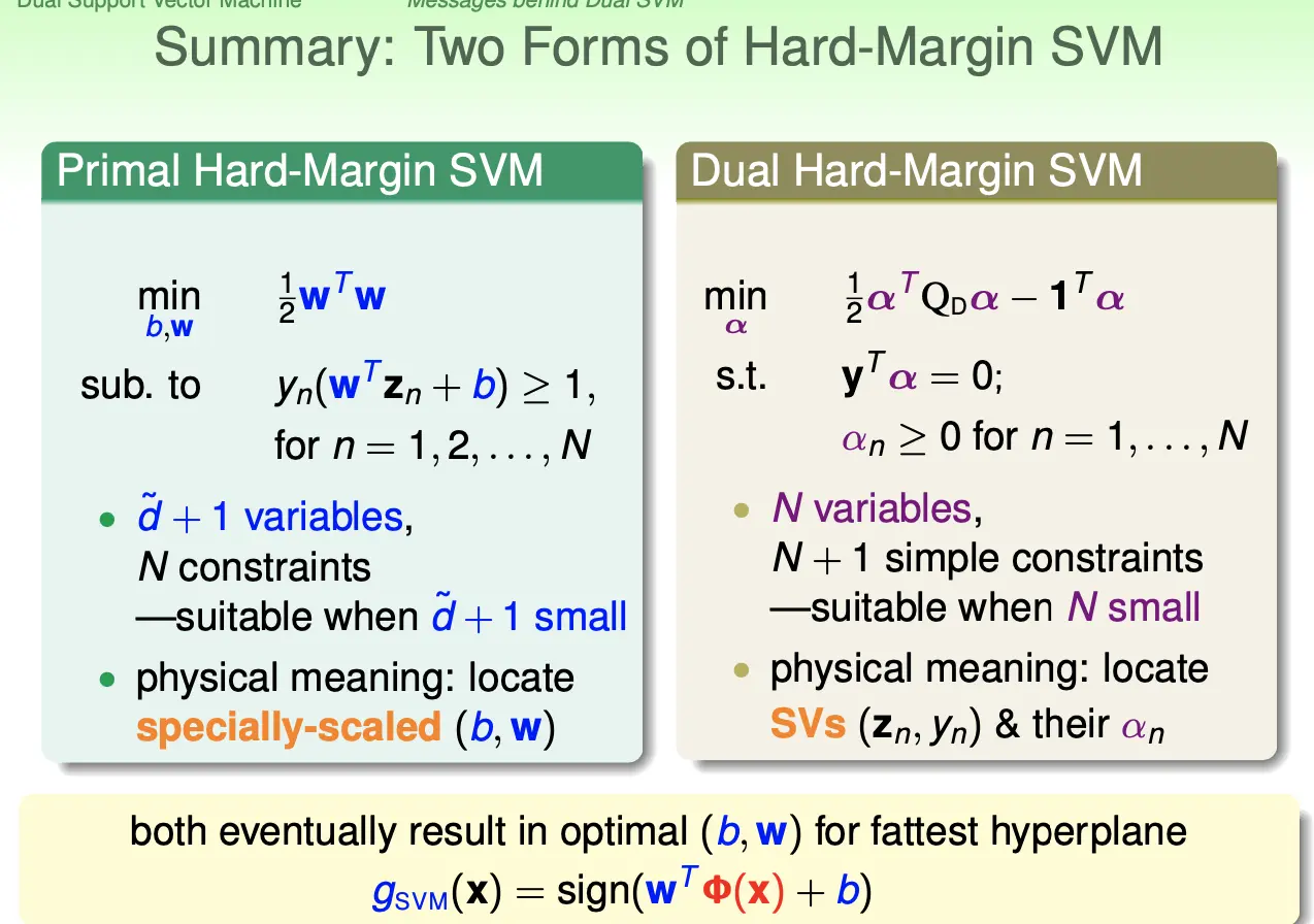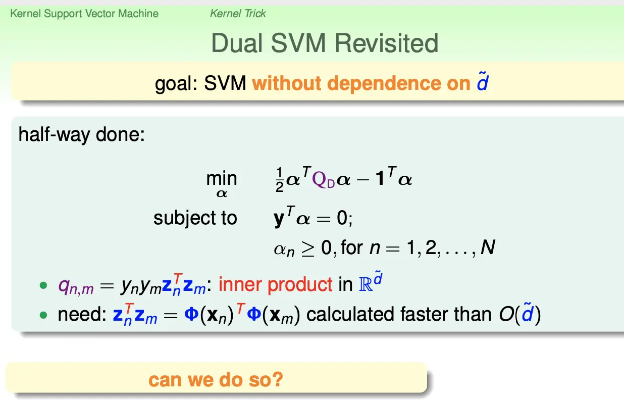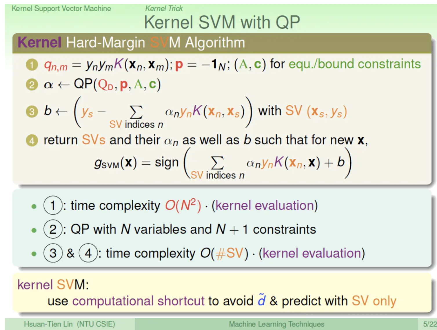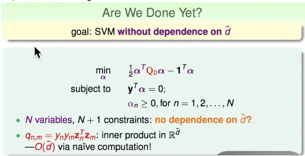 (这里的对偶形式,是经过QP solver后的结果)如上图中原问题中,求解复杂度与w的维度有关即d~ + 1, d为什么有个~呢,是因为这里代表的是feature空间转换成更高维的空间后的结果(不是kernel),而对偶问题就是跟样本数量有关,所以如果做线性分类,样本数量高于维度的话,完全可以用原问题直接求解。可如果做非线性分类,那么必然涉及到加kernel的操作,会提升到高纬度(kernel往下看),那就要用对偶问题来做了。