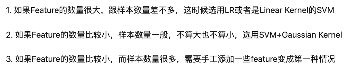 - if your number of features is really large compared to the training sample, just use linear kernel; if your number of features is small, but the training sample is large, you may also need linear kernel but try to add more features; if your feature number is small (10^0 - 10^3), and the sample number is intermediate (10^1 - 10^4), use Gaussian kernel will be better.----抄自stackflow