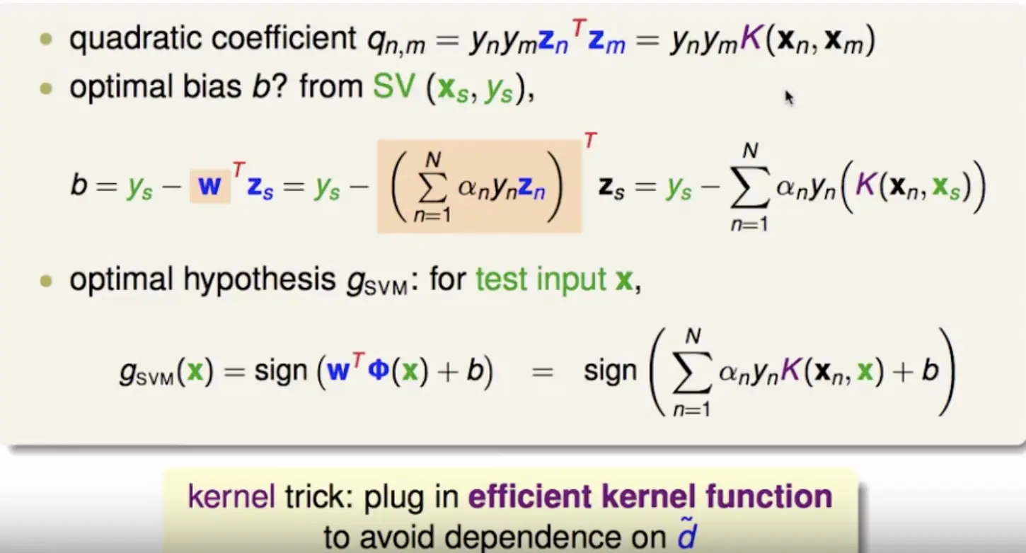 这里zz我们用K(x,x)来代替,那么同理,我们不再用z空间的数据,那求b啊啥的都得用kernel代替。这样搞,我们就避免了要在z空间做内积的计算复杂了(我们之前所有的非线性东西,用的都是z空间的数据,z空间是将x空间的数据进行维度转换得来的,如加个平方啊,三次方啥的)