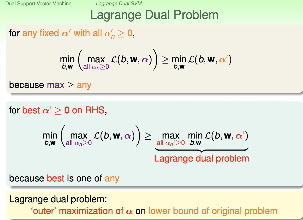 我们先看上图的第一幅图,我们先假设有一个固定的α'在右边式子,那么因为我们左边的式子是max α,所以说他是最大的没问题吧,那么max >= any 大于任意一个α’也没问题吧,那么就有左边的 >= 右边的。